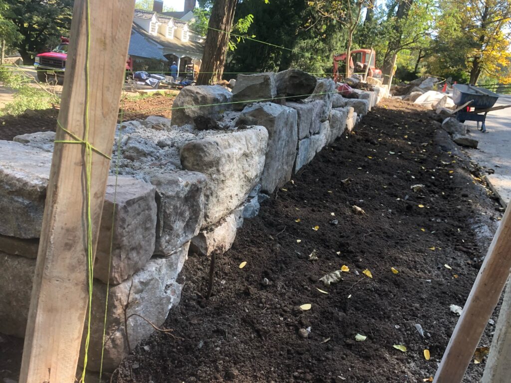 Exactly what type of fence is being proposed? It’s a 30″ high stone fieldstone fence (dry-laid, mortar-back) running along — and 4 feet back from the edge of — the abutting roads, Talmage Road and Cherry Lane. A small, unfinished sample the Borough subsequently forced me destroy is pictured just above. It is replacing a combination of a 40-year old wooden fence, a section of a centuries old stone fence and a privat hedge, all of which have been partially destroyed over recent years by multiple irresponsible (drunk and/or distracted) passing motorists careening onto our property.